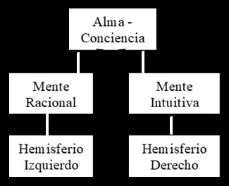The mind is at a lower level than the soul. It consists of intuitive mind and rational mind, which correspond at the physical level to the right (synthetic) and left (analytical) cerebral hemispheres, respectively.