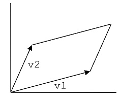 The outer product of two vectors v1 and v2, in the space nD, is the algebraic or arithmetic product of both vectors, but with interpretation of the product of the basic vectors < code>ei*ej as the surface of the parallelogram formed by the vectors ei and ej. The surface is oriented, that is, it has sign, with the following criterion: if i<j, then the surface is ei*ej. If i>j, then ei*ej is −(ej*ei). Evidently, (ei*ei = 0).