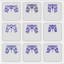 The surviving offspring becomes the new parent bioform of the next generation. It will occupy the center of the matrix and generate 8 mutations. And so on until the expected number of recursions is reached. The final appearance (phenotype) emerges from the evolutionary chain and the accumulated changes of the "genetic code" (the sequence of gene values) of the bioform, and can become very complex. Each gene in a bioform contributes to one aspect and is present at all levels of the pattern.