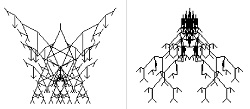 When Dawkins ran his bioform evolutionary program, he was amazed at the great variety of forms that appeared, reminiscent of real-world biological forms such as insects, trees, flowers, shrubs, beetles, butterflies, spiders, frogs, scorpions, bats, etc.. But non-biological forms also appeared, such as Aztec temples, Gothic church windows, scales, goblets, and even letters of the alphabet. Then Dawkins became aware that he had created a universe of forms which he called "Biomorph Land".