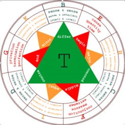 Represents the relative. It is a circle showing the letter T in the center, with a crown divided into 9 chambers (also represented by the same 9 letters), and in which 3 triangles are inscribed, forming 9 small external triangles corresponding to the relative principles. The chambers and the triangles establish fixed relations, that is to say, this figure does not contemplate any combinatory, because it is only a visual artifice to better remember the fixed relations between the relative principles and the chambers.