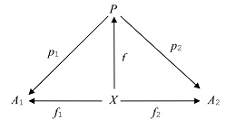 The product of two objects A1 and A2 of category C is another object P = A1×A2, so that two morphisms p1: P→A1 y p2: P→A2, for every object X, and for every pair of morphisms f1: X→A1 y f2: X→A2, there is only one morphism f:X→P that satisfies.