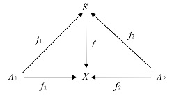 The sum −also called coproduct or dual product− of two objects A1 and A2 of category C is another object S = A1+A2, such that two morphisms j1: A1→S y j2: A2→S such that for every object X and for every pair of morphisms f1: A1→X y f2: A2→X there is only one morphism f:S→X that satisfies.